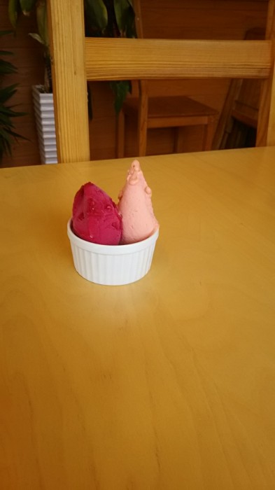 ソルベッチに新しい味が登場しました! 「しそソルベ」です。赤紫蘇で作ったので色も鮮やかです。 期間限定品です! 左;しそソルベ 右;すももソルベ